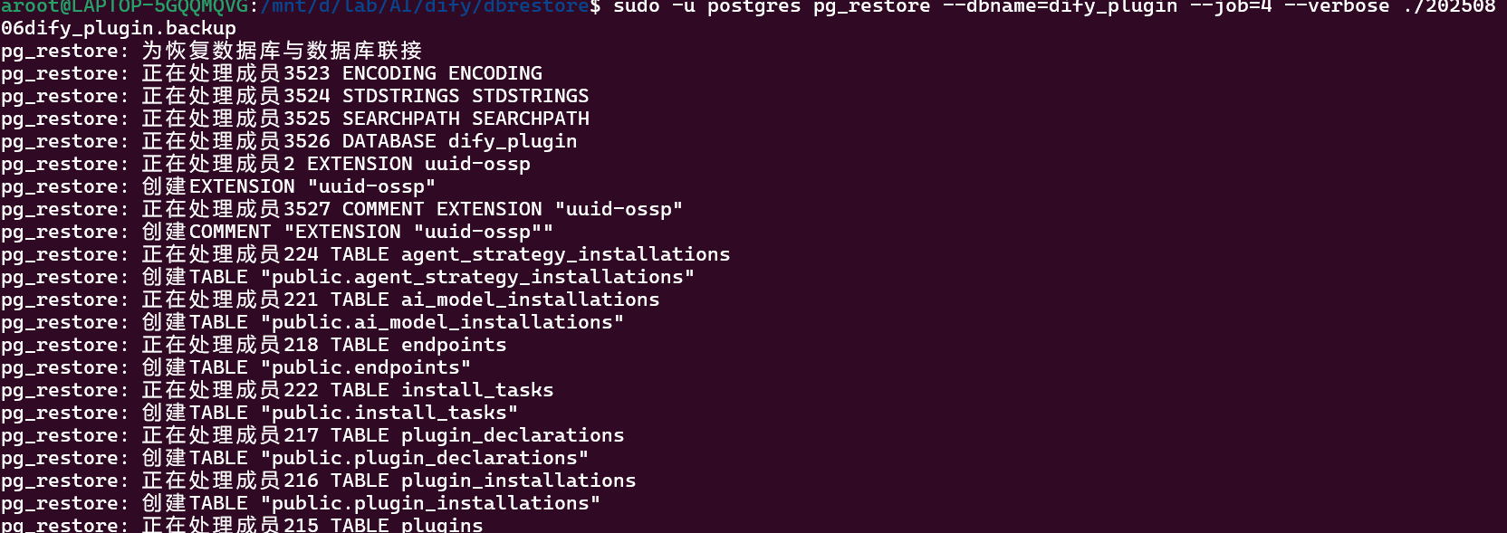 sudo -u postgres pg_restore --dbname=dify_plugin --job=4 --verbose ./20250806dify_plugin.backup
