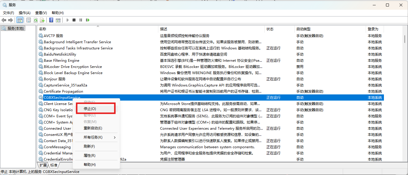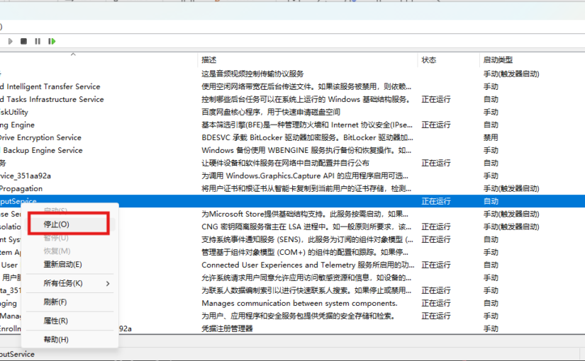 在具体服务上右键菜单中寻找“停止”,推荐在属性中彻底“禁用”。